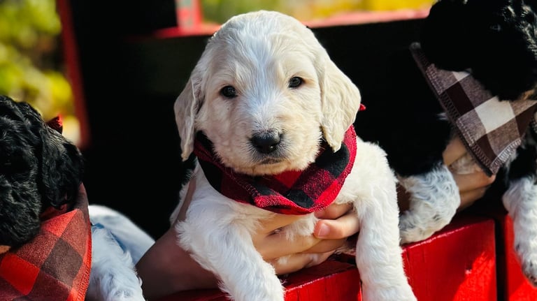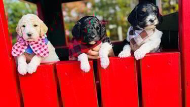 Our current puppies are F1BB Bernedoodles- the most hypoallergenic and nonshedding combo! Parents both have very sweet and loving personalities. Dad is a 65 lb Standard Purebred Poodle and Mom is a tall, lean 55 lb F1B Bernedoodle. Our female puppies average Mom's weight between 50-55 lbs, while our male puppies are right around Dad's weight of 65 lbs when full-grown.