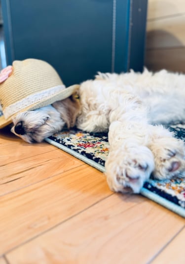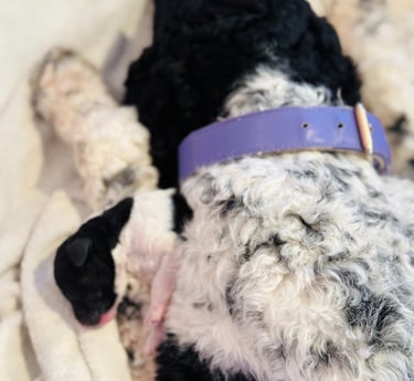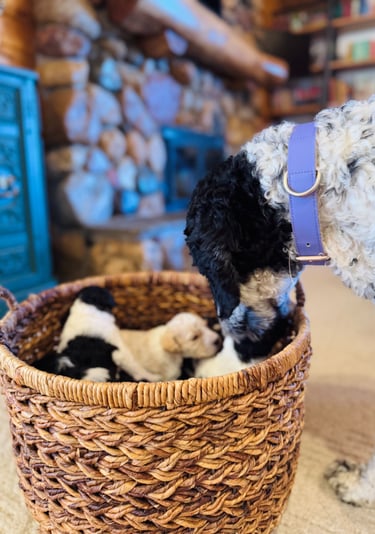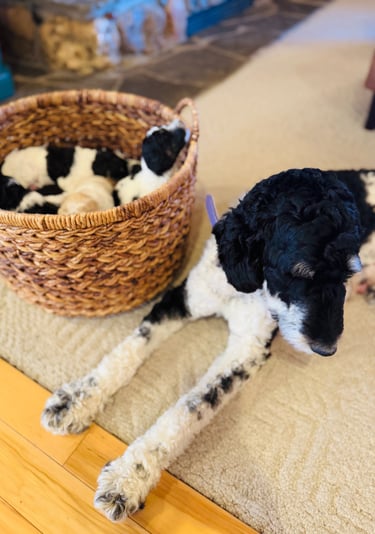 During the newborn phase, we are dedicated to full-time puppy care and the puppies snuggle, nurse and grow right in our family's main living space. As newborns, they even sleep in our Master Bedroom with their Mama in their whelping box so we can keep a close ear open for any possible distress or need to be repositioned for safety in the middle of the night. When they grow and during their weaning phase, we move them to a designated, safe and warm puppy play-space in our attached garage and we rotate them in and out of our home. This allows us to give them plenty of individual love and attention and also allows your puppy time away from humans to help promote healthy separation. Although, they are never truly alone during this precious time with their sibling littermates before they leave their first family and meet their fur-ever families! While in our home, we will expose them to lots of sights, desensitization sounds, people, and our other two family dogs (in addition to their Mama!) to help start their socialization process. When they are vaccinated and old enough for adventures, we will also take them "out-and-about" in the car and (in summer) on the boat to help promote even further readiness for the outside world!