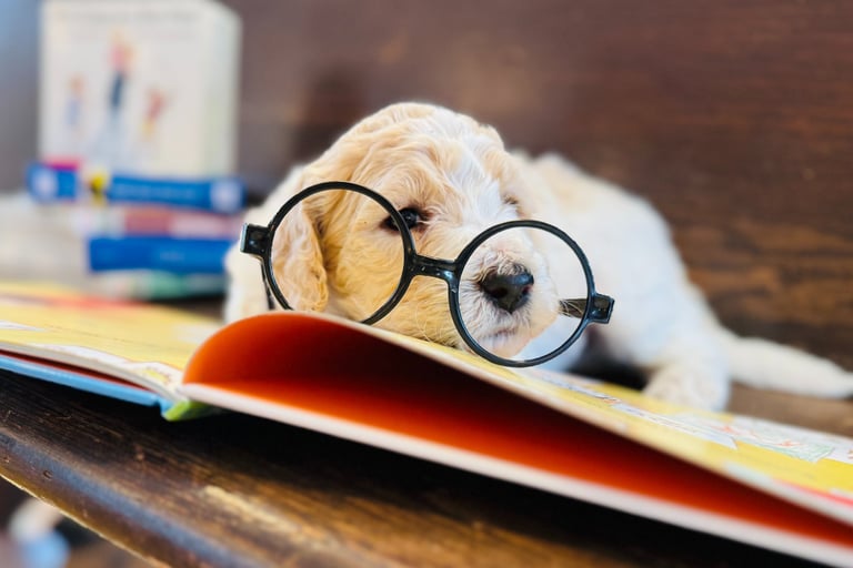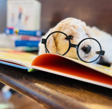 "Green Gables” is more than a place, it’s a nod to our literary love, “Anne of Green Gables.” At our house: we love books and puppies! Of course, our very first litter had to have literary-themed names: Snow White, Happy, Grumpy, Doc, Bashful, Sleepy, Sneezy, Dopey (later, “Zoey,”) Hansel & Gretel. Our 2nd litter was given names inspired by some of our favorite folk-tales and tall-tales from American literature and history: Paul Bunyan, Babe the Blue Ox, Lucette "Lucy" Bunyan, Paul Jr., Betty Bunyan, Johnny Appleseed, Davy Crockett, Sally Ann Thunder Ann Whirlwind Crockett (Sally Ann for short ;), Daniel Boone and Calamity Jane. (Sounds like a wild crew- but they are oh, so sweet!)
