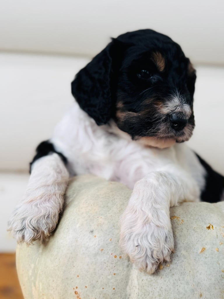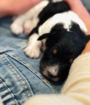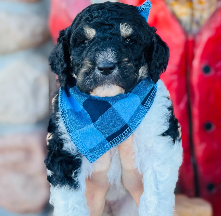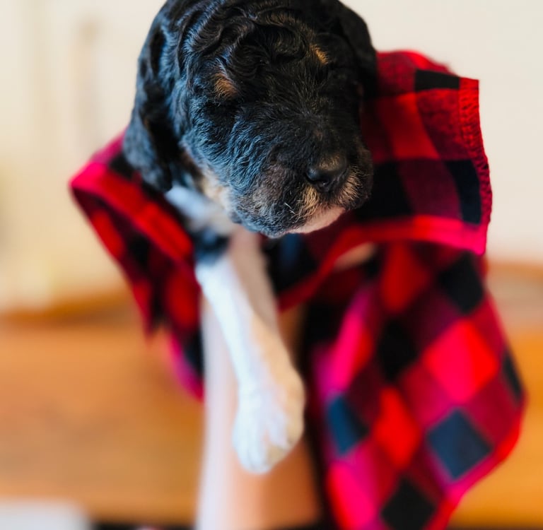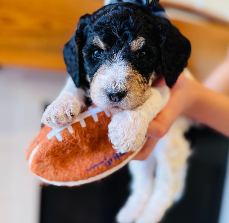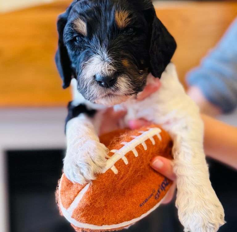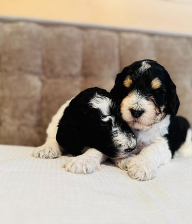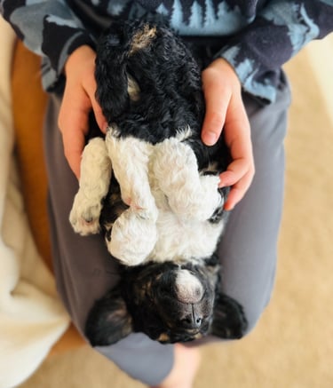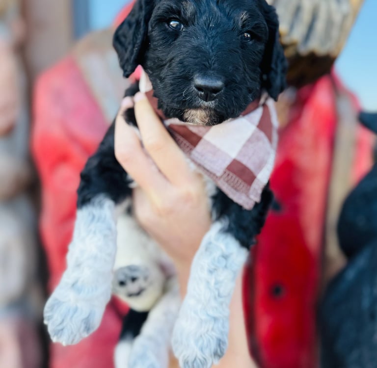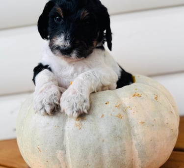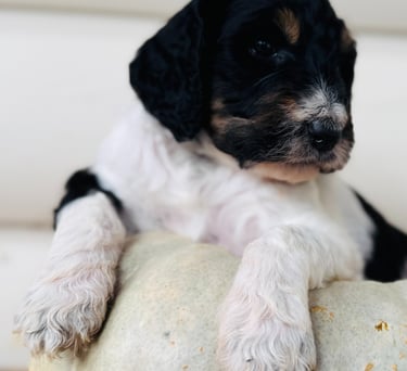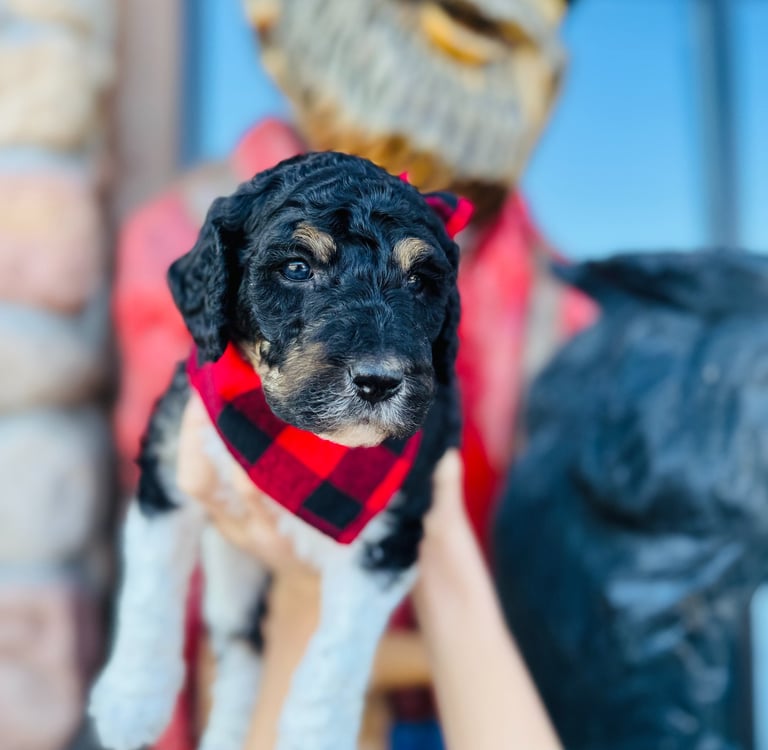 In Fall 2025, we welcomed Oreo's 2nd litter! 10 Beautiful Bernedoodles- 5 Boys + 5 Girls we named: Paul Bunyan, Lucette Bunyan, Betty Bunyan, Paul Jr., Babe the Blue Ox, Johnny Appleseed, Daniel Boone, Calamity Jane, Davy Crockett and Sally Ann Thunder Ann Whirlwind Crockett! They sound like a WILD crew, but they were oh, so sweet!