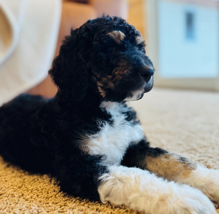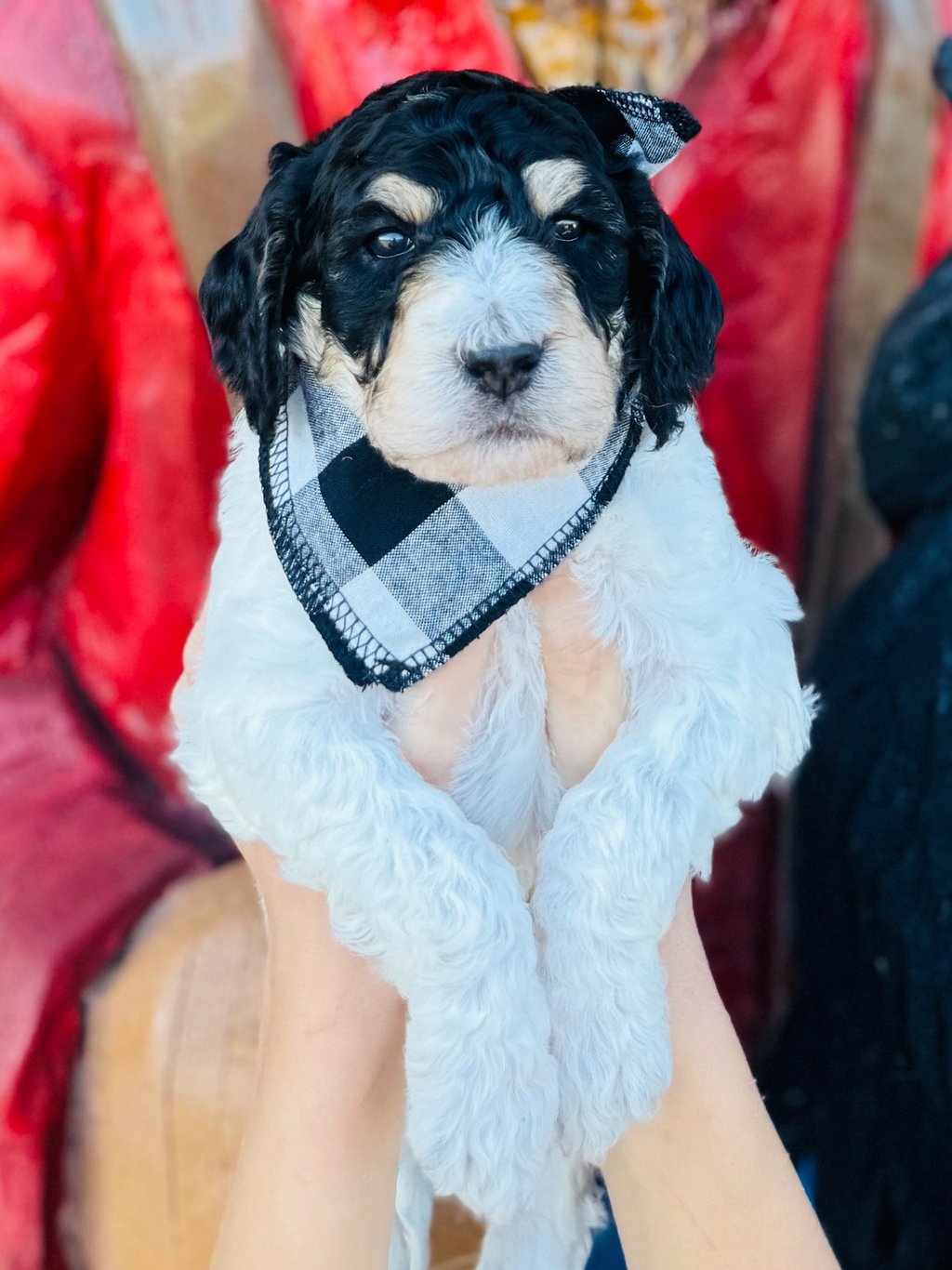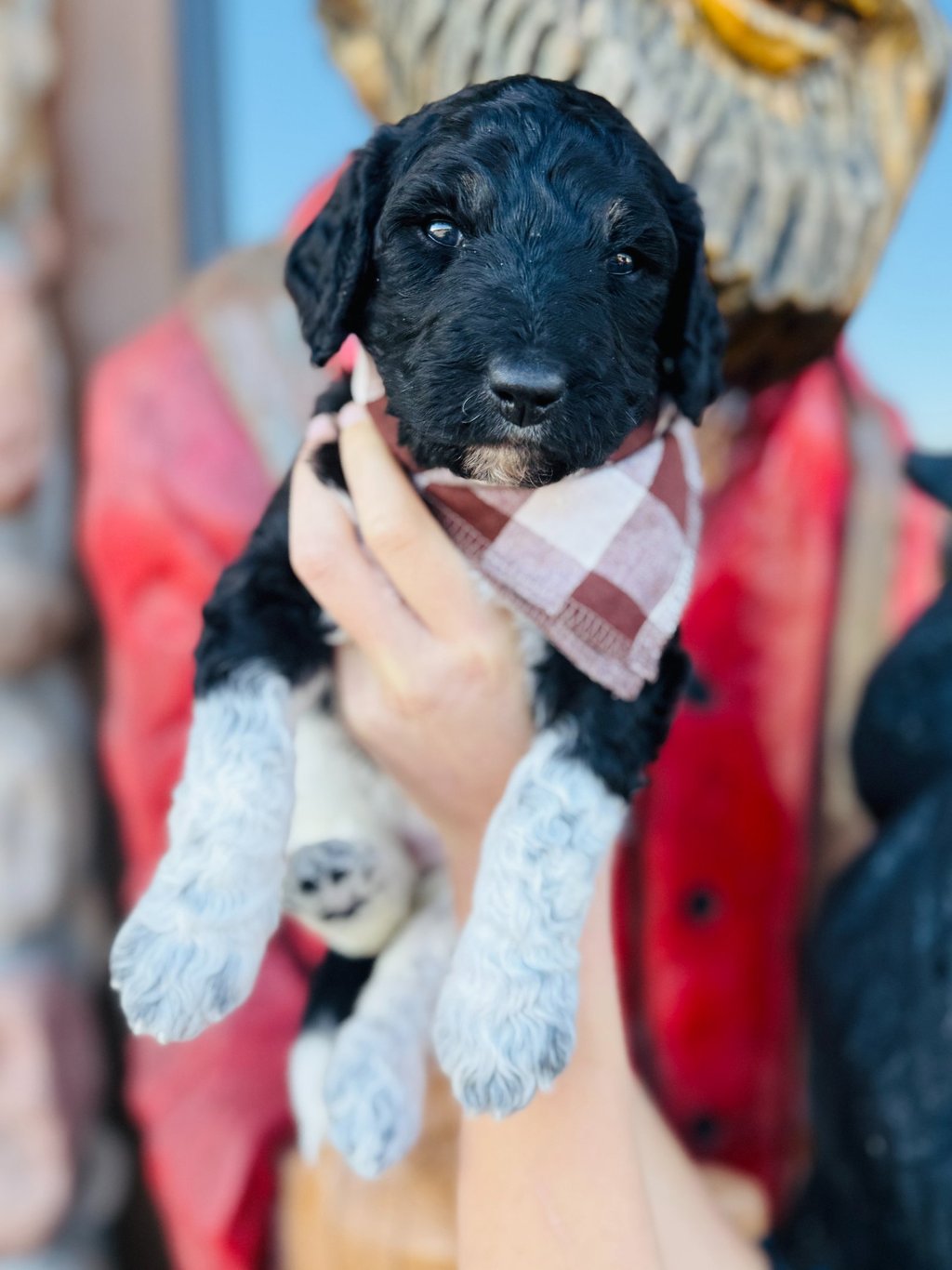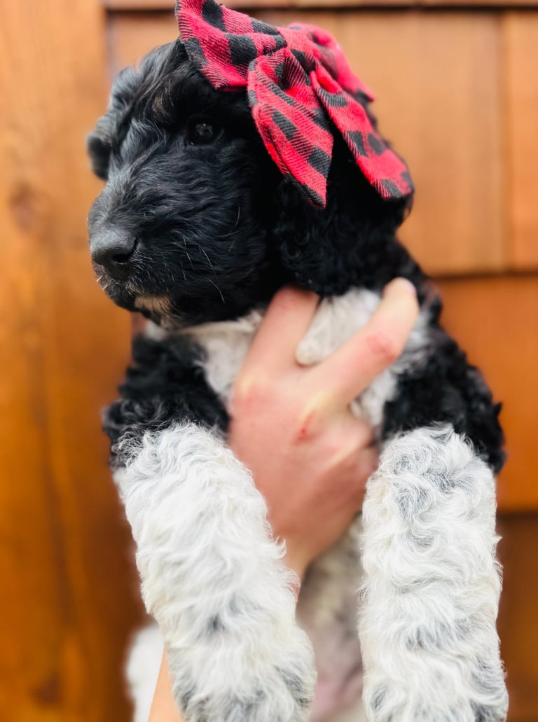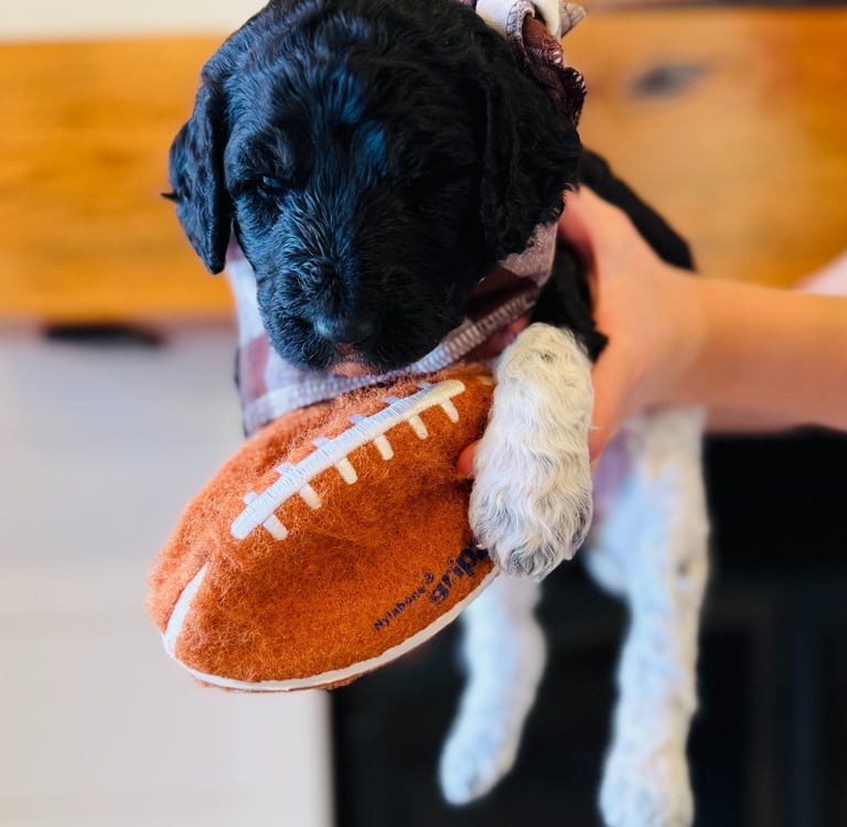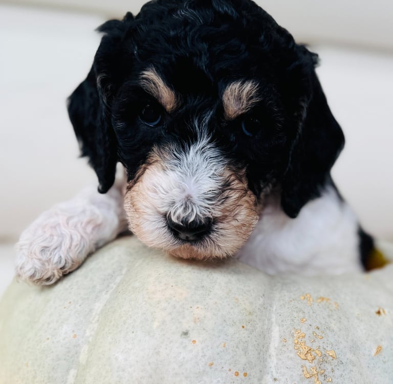 In Fall 2025, we welcomed Oreo's 2nd litter! 10 Beautiful Bernedoodles- 5 Boys + 5 Girls we named: Paul Bunyan, Lucette Bunyan, Betty Bunyan, Paul Jr., Babe the Blue Ox, Johnny Appleseed, Daniel Boone, Calamity Jane, Davy Crockett and Sally Ann Thunder Ann Whirlwind Crockett! They sound like a WILD crew, but they were oh, so sweet!
