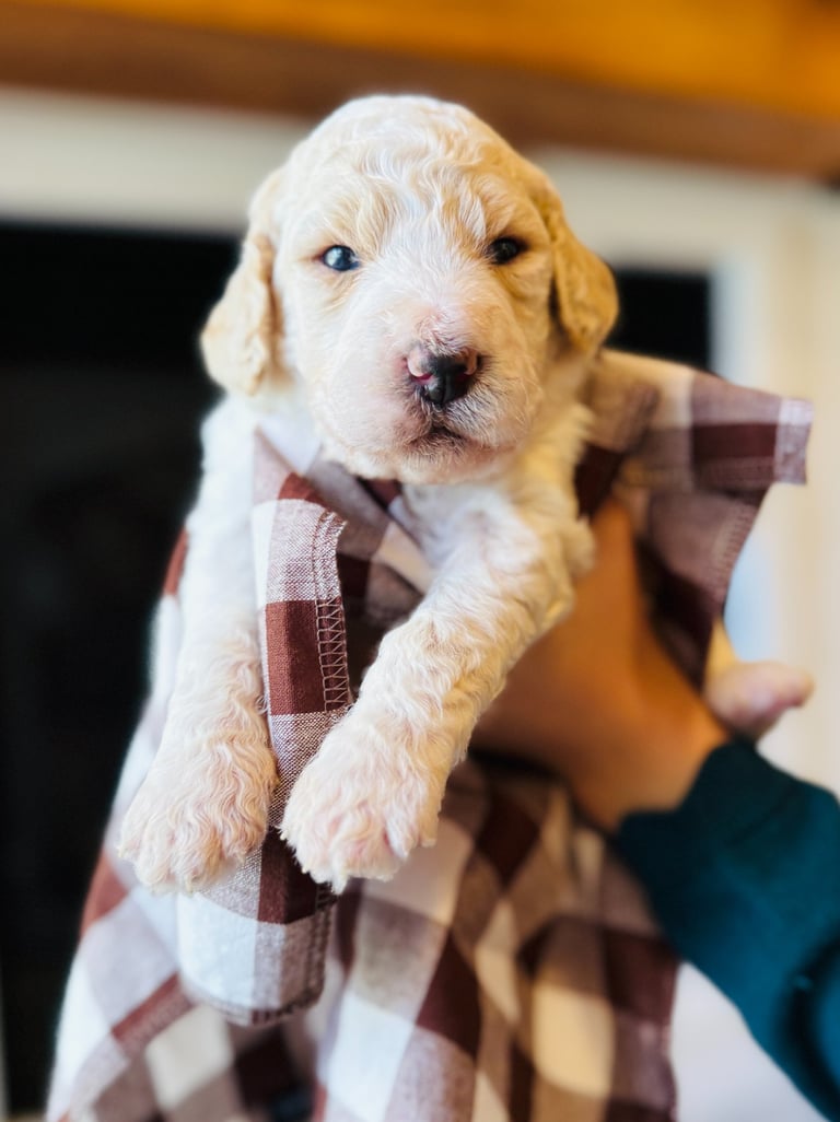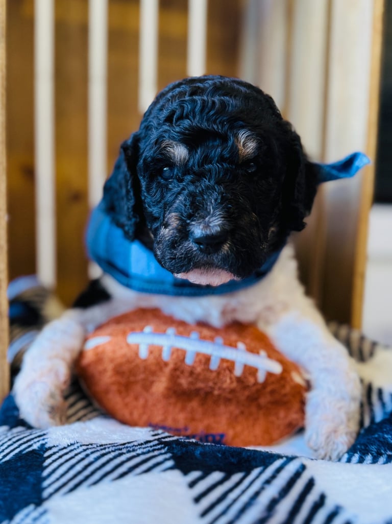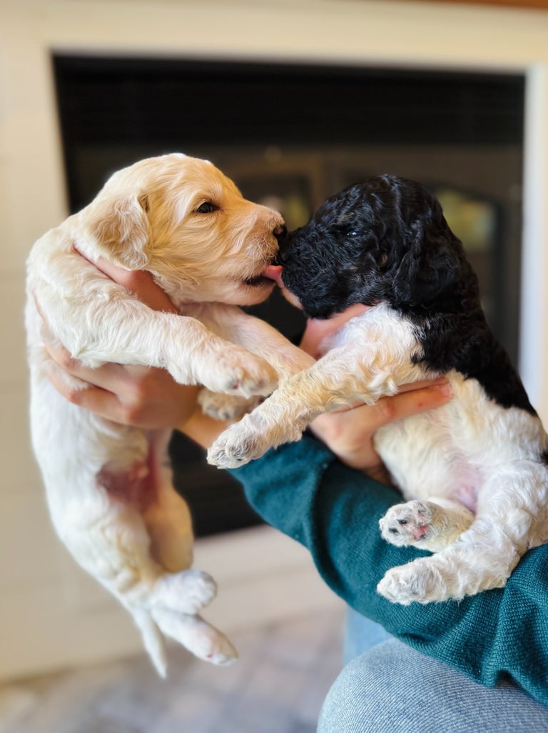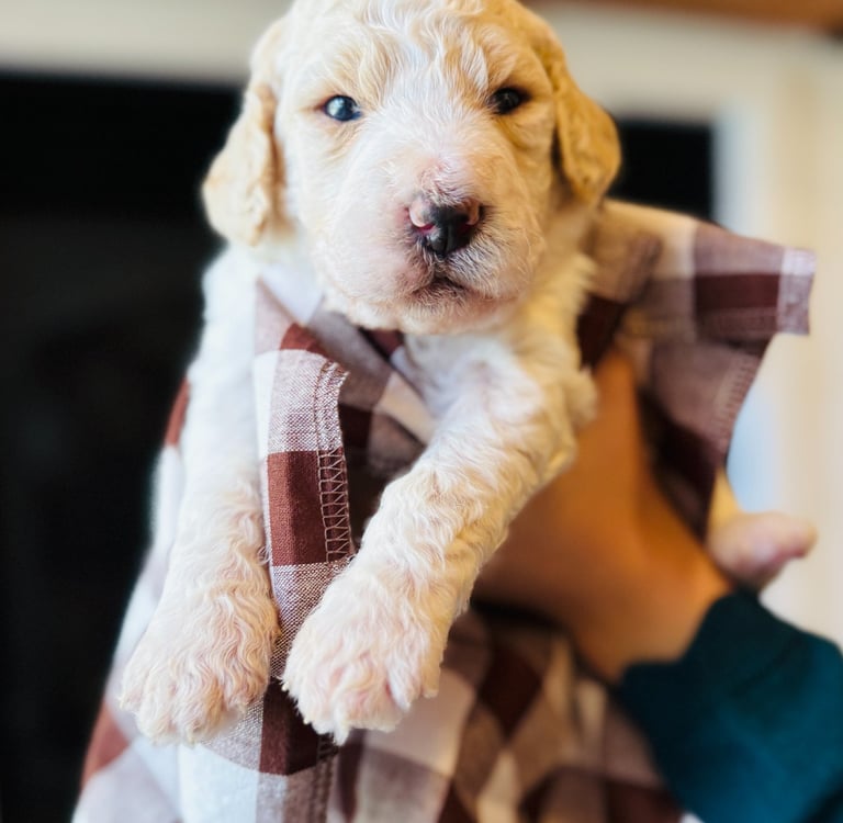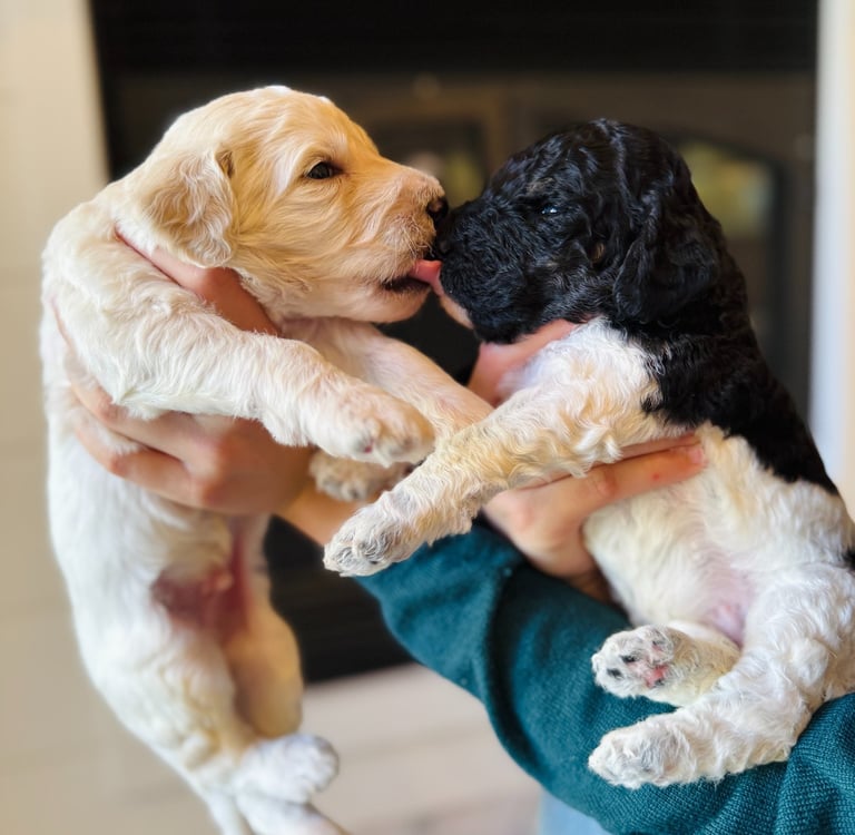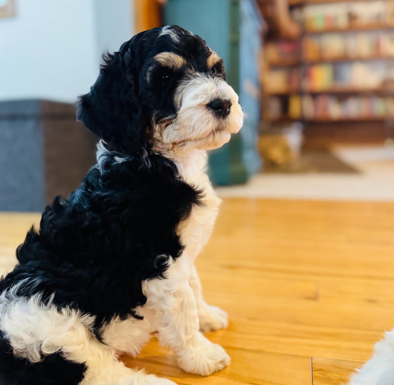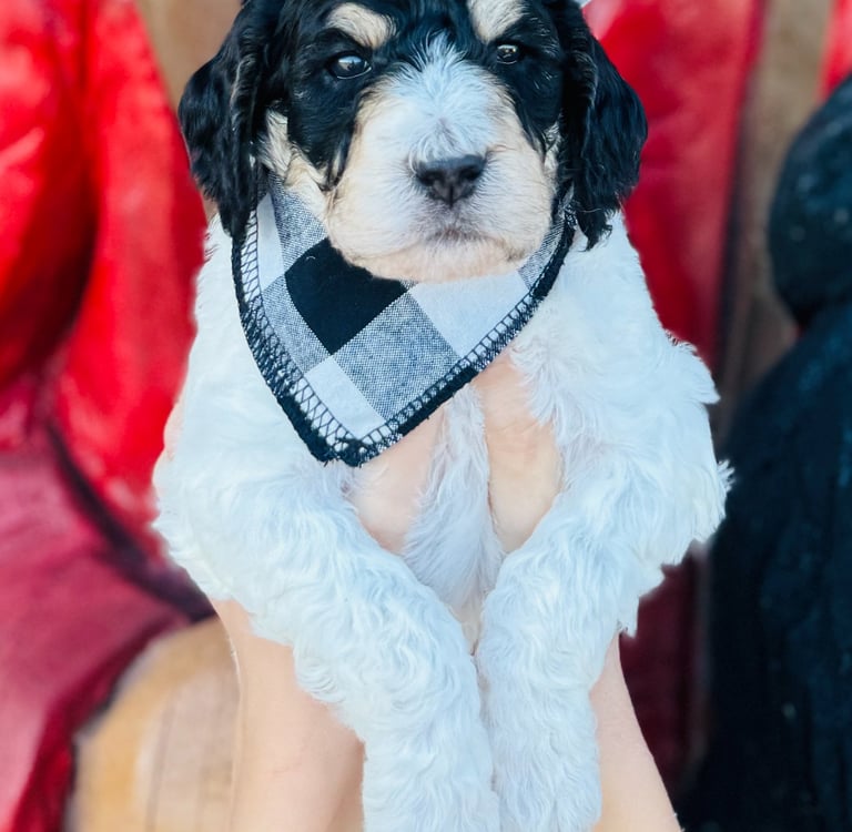 In Fall 2025, we welcomed Oreo's 2nd litter! 10 Beautiful Bernedoodles- 5 Boys + 5 Girls we named: Paul Bunyan, Lucette Bunyan, Betty Bunyan, Paul Jr., Babe the Blue Ox, Johnny Appleseed, Daniel Boone, Calamity Jane, Davy Crockett and Sally Ann Thunder Ann Whirlwind Crockett! They sound like a WILD crew, but they were oh, so sweet!